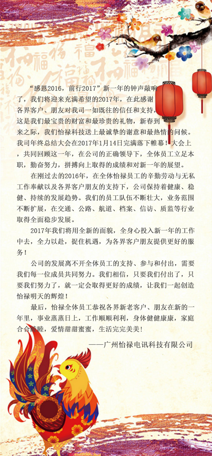 金鸡迎新春,怡禄科技祝各界朋友新的一年红红火火