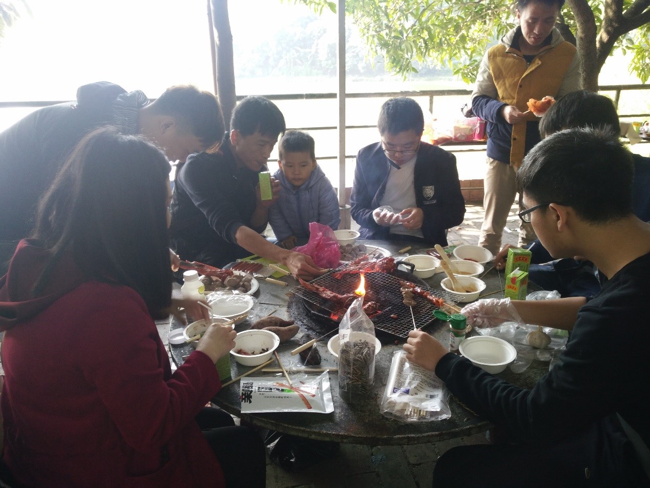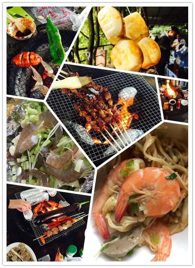 本次烧烤目的地在美丽的火炉山脚,小伙伴们分工合作,买菜、搬东西、生火、洗菜、切菜、串串……