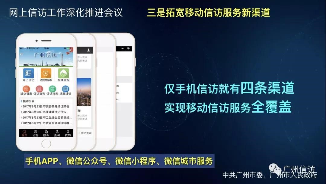 紧贴群众对移动、互动和多媒体新技术应用的需求,在开通手机信访和微信公众号的基础上,又增设了微信小程序和城市服务两条网上信访新渠道,做到移动服务全覆盖。