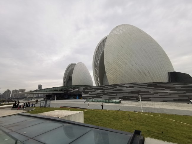 珠海大剧院造型独特,其设计方案不仅来自日月贝这一独特的海洋物种,更对 贝壳的形象加以提炼,用现代建筑材料和技术进一步表现空间的意义。一大一小两 组贝壳的形体,构成了歌剧院的整体形象,在城市相当广泛的区域内都可以看到它伫立在海面之上。